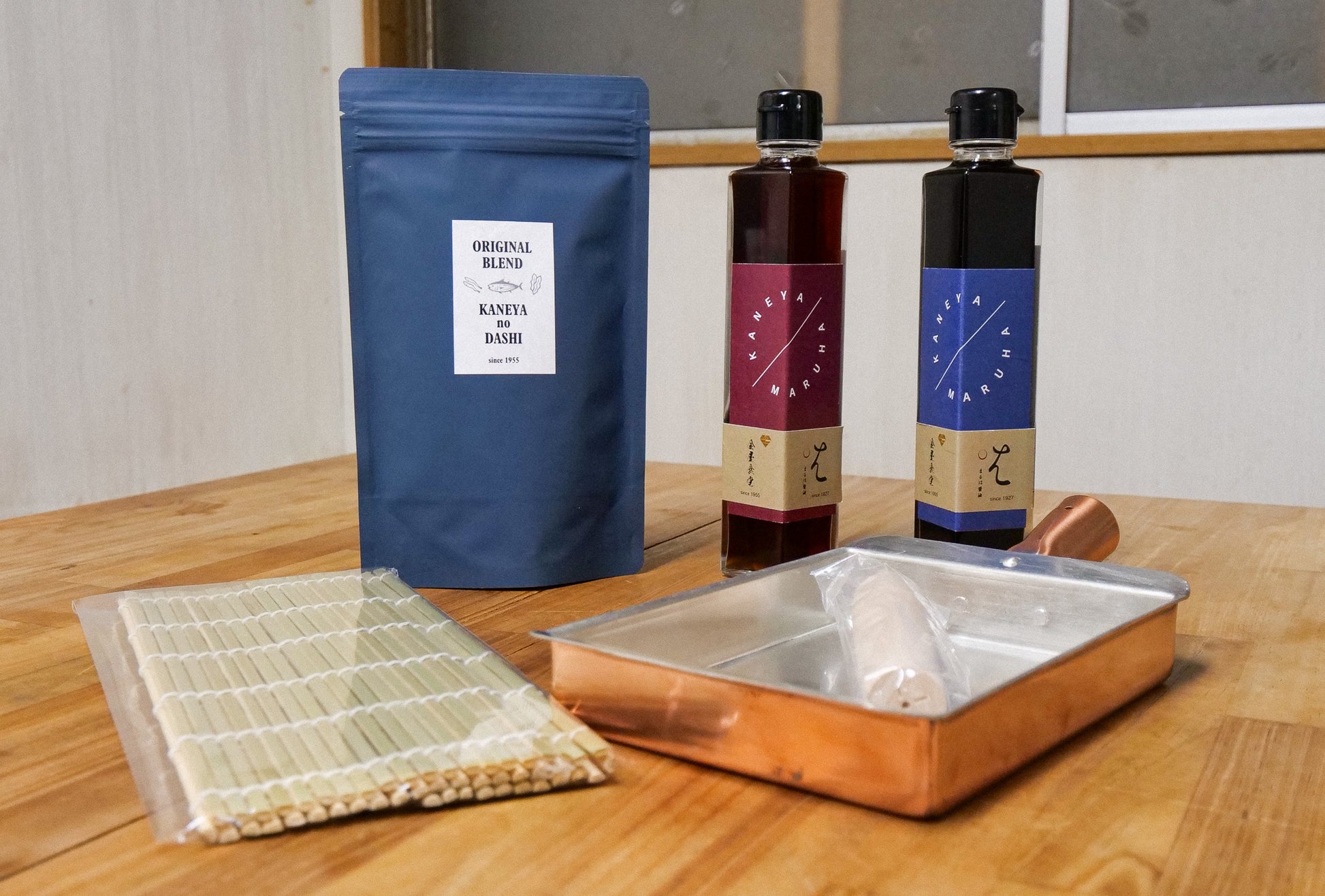 【IH対応不可】あの金屋食堂の味が、ご自宅でも楽しめます。幾度もメディアで紹介された名物のだし巻き玉子をもっと気軽に家庭で作ってほしい。出汁パック・薄口醤油・濃口醤油・フライパン・巻き簀を揃えた特別なセットでお届けします。