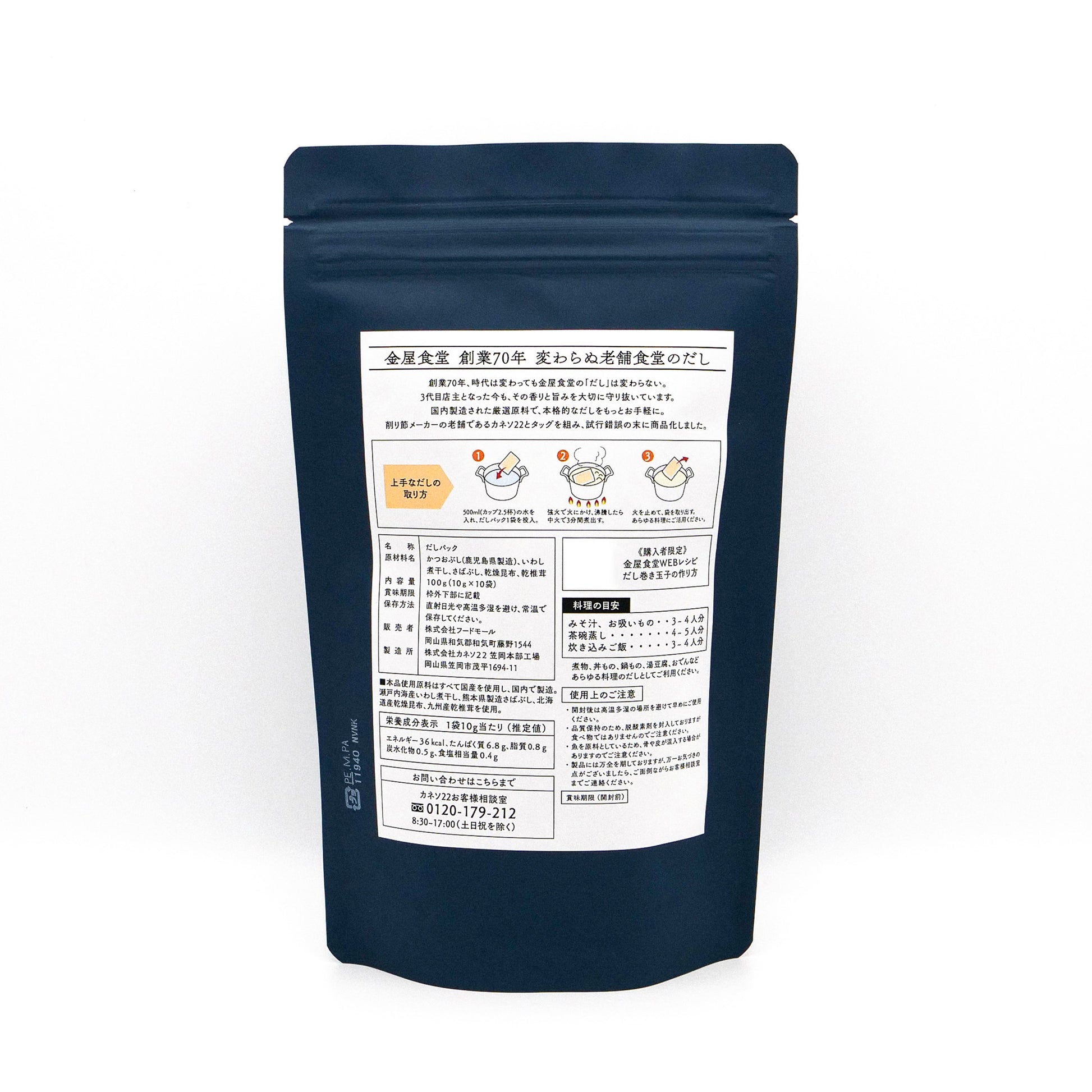 金屋食堂の味を守り続けてきた「だし」をベースに開発したオリジナル出汁パックで、毎日の料理に本格的な風味をお届けします。