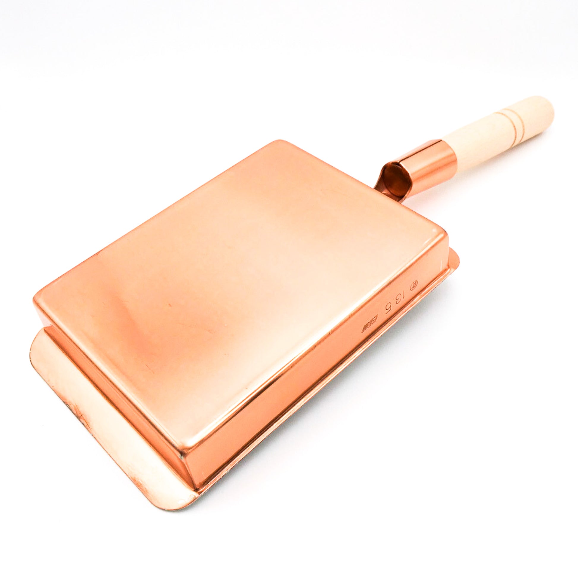 内寸 13.5cmx(18cm+木柄)x深さ3cm 銅厚 0.1cm